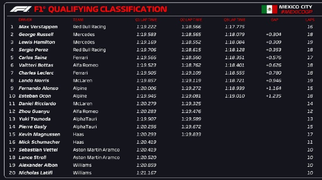 24直播网讯 2022年F1墨西哥大奖赛排位赛结束。红牛车队维斯塔潘凭借Q3完美的发挥,取得杆位!墨西哥大奖赛再次见证新的杆位得主诞生!梅赛德斯车队拉塞尔第二,汉密尔顿第三。主场作战的佩雷兹第四。红牛和梅赛德斯车队包揽前四!