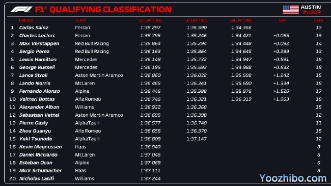 佩雷兹、汉密尔顿、拉塞尔、斯托尔、诺里斯、阿隆索、博塔斯分获四至十位。中国车手周冠宇因为飞驰圈驶出赛道限制遗憾未能进入到Q3。