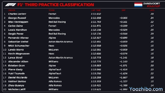 2022年F1荷兰大奖赛第3次练习赛成绩表