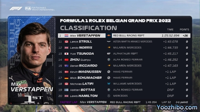 2022年F1比利时大奖赛正赛成绩表: