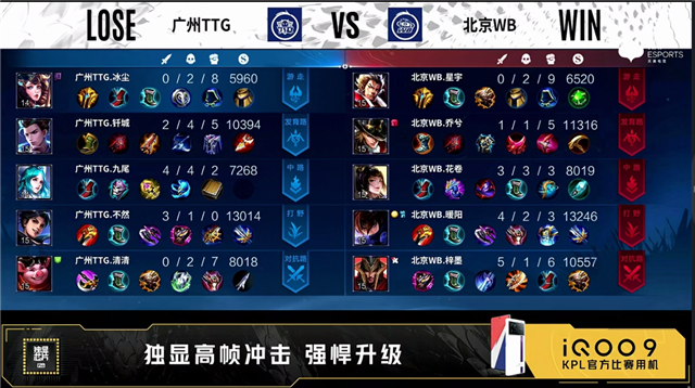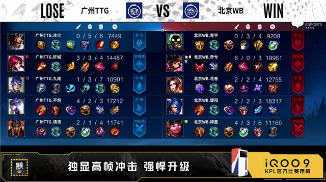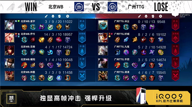 2分35秒,中路团,广州TTG镜击杀太乙真人拿下一血。3分10秒,野区团,广州TTG打出1换2。4分06秒,北京WB拿下暴君,随后广州TTG镜像控下先知主宰。4分39秒,北京WB下路越塔击杀伽罗。6分03秒,广州TTG破掉北京WB中一塔。6分21秒,双方互换边路一塔。6分53秒,北京WB中路击杀牛魔。7分16秒,北京WB破掉广州TTG上一塔。8分18秒,广州TTG上路击杀太乙真人。8分24秒,北京WB拿下暴君,中路团,北京WB击杀伽罗。8分48秒,北京WB破掉广州TTG下二塔。9分14秒,北京WB拿下主宰。11分10秒,野区团,广州TTG打出0换1。12分09秒,广州TTG拿下暗影主宰,北京WB拿下暗影暴君,随后北京WB破掉广州TTG中一塔。13分32秒,北京WB破掉广州TTG中二塔。15分钟,北京WB破掉广州TTG下路高地塔。16分10秒,北京WB同时控下下暗影暴君和暗影主宰。16分50秒,上路团,双方1换1。20分30秒,广州TTG野区击杀猪八戒。21分07秒,北京WB橘右京抢下风暴龙王,龙王团,双方打出3换3。21分54秒,北京WB破掉广州TTG中路高地塔,随后击杀蒙恬。22分28秒,北京WB击杀弈星后摧毁水晶拿下赛点。