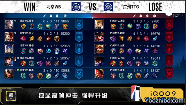 47秒,野区团,双方1换1。2分18秒,北京WB拿下暴君。3分18秒,北京WB蒙恬越塔击杀王昭君。4分26秒,广州TTG中路击杀张飞。5分16秒,北京WB破掉广州TTG上一塔。6分钟,中路团,广州TTG打出1换1。7分14秒,广州TTG控下暴君。7分29秒,北京WB破掉广州TTG上二塔。7分45秒,中路团,双方1换1。9分10秒,北京WB破掉广州TTG下一塔。12分40秒,北京WB拿下暗影主宰,中路团,广州TTG打出1换2。13分30秒,北京WB破掉广州TTG中一塔。14分40秒,暴君团,双方1换1。16分钟,北京WB中路击杀王昭君。16分21秒,北京WB拿下暗影暴君,随后主宰团北京WB打出0换3。17分钟,北京WB越塔击杀王昭君后上路一波摧毁水晶连下两城。