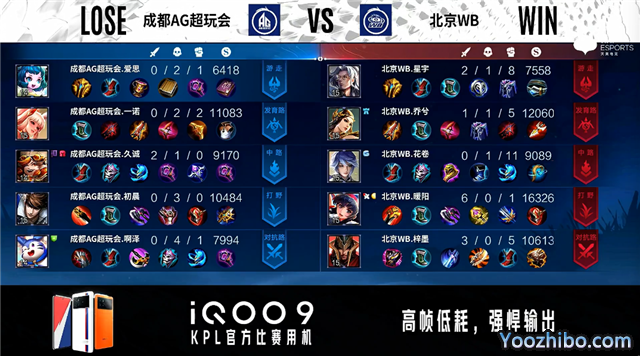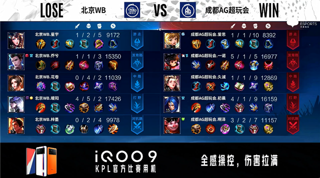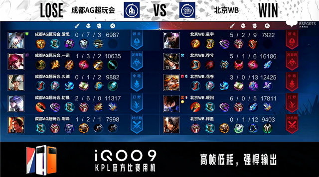 双方常规开局。1分57秒成都AG对抗路击杀不知火舞拿到一血。2分22秒成都AG拿下暴君。3分22秒野区团战成都AG野区击杀镜。4分09秒成都AG野区打出0换2。5分48秒北京WB摧毁敌方发育路二塔。6分46秒成都AG摧毁敌方中路外塔。8分50秒北京WB摧毁敌方中路外塔。9分30秒对抗路团战成都AG打出2换3,北京WB摧毁敌方对抗路二塔。11分59秒中路团战双方1换1。14分10秒北京WB抢到暗影主宰。14分57秒中路团战成都AG打出0换3。17分56秒成都AG拿下暗影主宰。18分05秒北京WB摧毁敌方发育路高地塔。18分18秒野区团战成都AG击杀镜。18分56秒成都AG摧毁敌方发育路二塔。19分05秒成都AG摧毁敌方中路二塔。19分36秒成都AG摧毁敌方对抗路二塔。19分52秒成都AG摧毁敌方中路高地塔。21分31秒成都AG龙王处打出0换2。22分03秒成都AG强点敌方水晶拿下比赛。