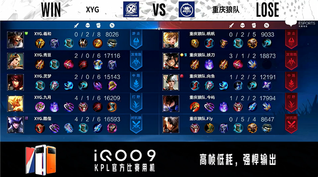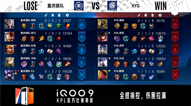 开局双方射手中路抢线。45秒XYG反掉敌方红BUFF。4分28秒重庆狼队中路下河道击杀猪八戒拿到一血。6分11秒暴君处团战重庆狼队打出1换2。7分44秒发育路团战重庆狼队打出1换5。8分15秒重庆狼队摧毁敌方中路二塔。9分45秒重庆狼队摧毁敌方发育路高地塔。10分16秒重庆狼队拿下暗影主宰。11分27秒重庆狼队摧毁敌方对抗路高地塔。11分42秒重庆狼队摧毁敌方中路高地塔。12分13秒重庆狼队摧毁敌方水晶拿下比赛。
