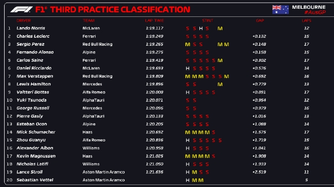 2022F1澳大利亚大奖赛第三次练习赛成绩表: