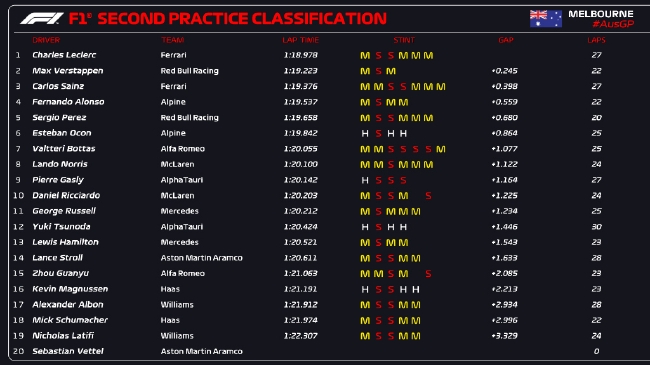 2022F1澳大利亚大奖赛第二次练习赛成绩表: