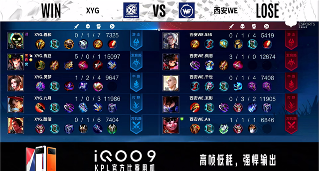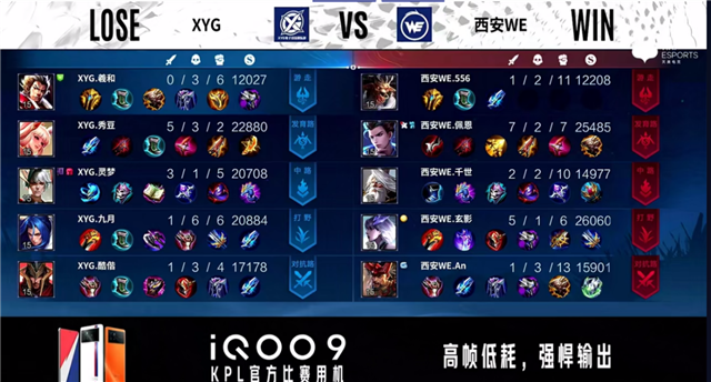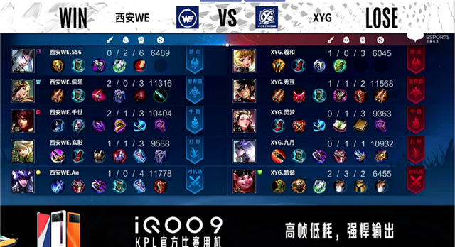 2分26秒,西安WE公孙离下路越塔击杀虞姬拿下一血。3分15秒,西安WE控下暴君。3分58秒,XYG下路越塔击杀王昭君。4分10秒,西安WE破掉XYG上一塔。5分13秒,西安WE控下先知主宰。5分35秒,XYG中路击杀夏侯惇。6分50秒,西安WE破掉XYG下一塔。7分35秒,西安WE拿下暴君。8分02秒,西安WE破掉XYG下二塔。8分30秒,XYG野区击杀夏侯惇。10分15秒,西安WE拿下暗影主宰,随后XYG破掉西安WE下一塔。10分46秒,西安WE拿下暗影暴君。11分04秒,西安WE先后破掉XYG中一塔和中二塔。11分34秒,西安WE中路击杀关羽。12分40秒,高地团,西安WE打出2换4,随后破掉上路高地塔点掉水晶连追二分拿下赛点。