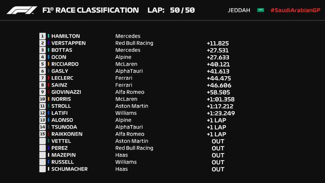 2021F1沙特阿拉伯大奖赛正赛成绩: