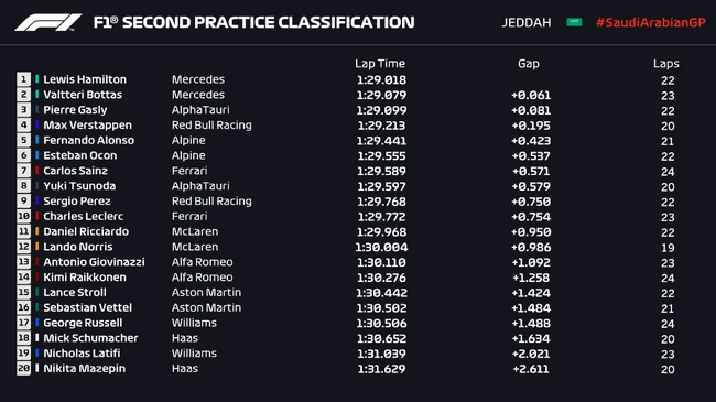 24直播网讯 2021年F1沙特大奖赛第2次练习赛在吉达海滨赛道结束,梅赛德斯车队汉密尔顿凭借1:29.018的成绩排名第一;队友博塔斯紧随其后位列第二,落后0.061秒,两人的最快圈速都是用中性胎做出的;小红牛车队加斯利排名第三;维斯塔潘第四,距离汉密尔顿有0.195秒的差距。
