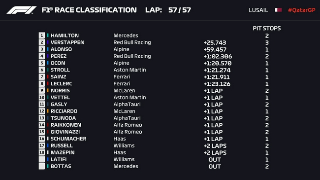一圈过后,威廉姆斯的另一辆车手拉蒂菲也出现爆胎,赛道上出示黄旗,直接将赛车开进缓冲区,退出了比赛。倒数第2圈,由于拉蒂菲的赛车需要吊车拖走,赛会出动了虚拟安全车,维斯塔潘马上由进站更换了一次轮胎,来保持最快单圈的优势。最后一圈,虚拟安全车结束,汉密尔顿率先撞线,拿下卡塔尔大奖赛冠军,维斯塔潘获得亚军,阿隆索收获季军。佩雷兹、奥康、斯托尔分别排在4-6位。