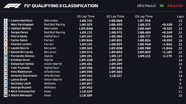 Q3第一次尝试,汉密尔顿飚出1分08秒107排在第一,维斯塔潘落后0.265秒排在第二。最后一跑,汉密尔顿刷新成绩,以1分07秒934拔得头筹,成为最快车手;维斯塔潘落后0.438秒排名第二;博塔斯、佩雷兹分列第三、四位。占据五至十位的车手依次为:加斯利、塞恩斯、勒克莱尔、诺里斯、里卡多和阿隆索。