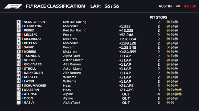 2021F1美国大奖赛正式比赛成绩表
