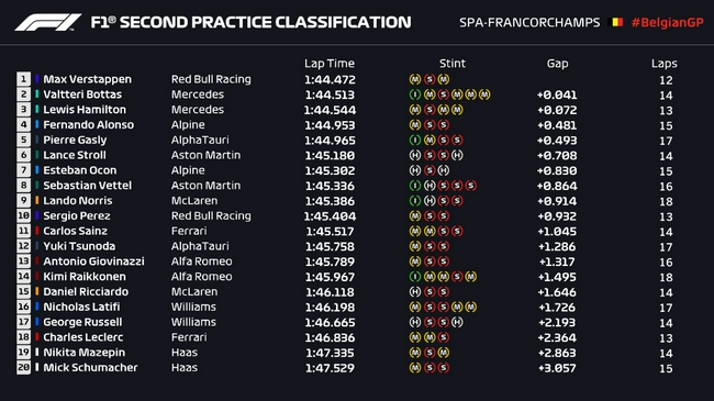 - 【录像】【腾讯】2021F1比利时大奖赛第二次练习赛 圈速2021-08-27 23:13:22