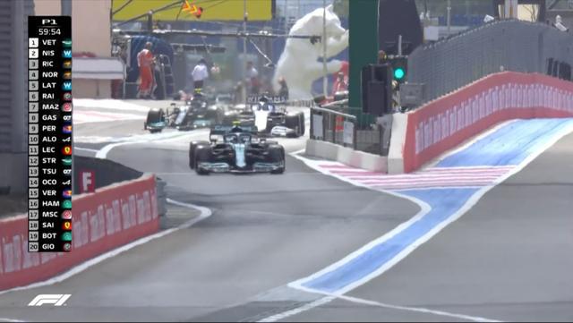 一练过半,博塔斯做出1:33.448的成绩上升到第一位,汉密尔顿第二,落后0.335秒,维斯塔潘、佩雷兹、阿隆索分列三至五。