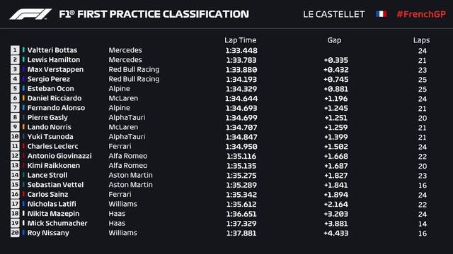 24直播网讯 北京时间6月18日,2021赛季F1法国大奖赛在保罗·里卡德赛道拉开帷幕。在首日练习赛中,博塔斯和维斯塔潘分别取得两次自由练习赛的第一,主场作战的Alpine车队也在首日练习赛中表现亮眼。