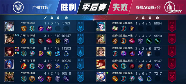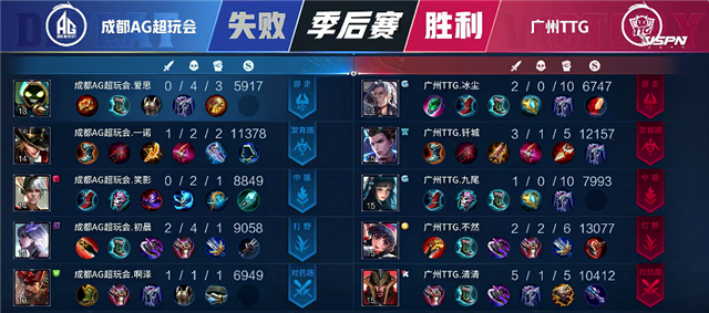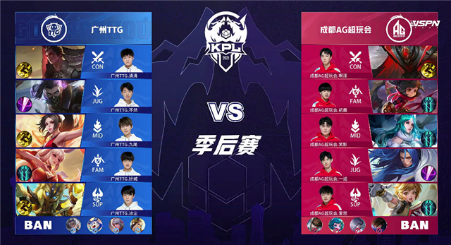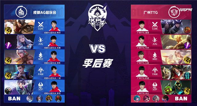 双方平稳开局。2分16秒百里玄策拿下暴君。5分18秒公孙离推掉下路一塔。5分25秒广州TTG推掉上路一塔。6分钟百里玄策拿下主宰。6分30秒广州TTG推掉下路一塔。6分35秒成都AG超玩会强攻中路一塔,公孙离拿下一血,成都AG超玩会推掉中路一塔。7分35秒百里玄策拿下暴君。9分28秒嬴政被击杀。10分钟成都AG超玩会推掉中路二塔。10分38秒百里玄策拿下暴君。11分25秒广州TTG推掉上路二塔。12分25秒百里玄策推掉上路二塔。12分40秒百里玄策拿下主宰。12分50秒百里玄策被击杀,成都AG超玩会推掉下路高地塔。14分55秒百里玄策拿下暴君。15分40秒成都AG超玩会强攻上路高地塔,团战成都AG超玩会打出1换2。17分钟野区团战,双方1换1。17分40秒成都AG超玩会拿下主宰。18分25秒公孙离推掉上路高地塔。19分25秒公孙离拿下暴君。19分40秒公孙离被击杀。20分24秒裴擒虎拿下风暴龙王。21分钟广州TTG推掉中路一塔。21分40秒广州TTG强攻上路高地塔,团战团灭成都AG超玩会,裴擒虎拿下双杀。21分56秒广州TTG点掉水晶再拿一分。
