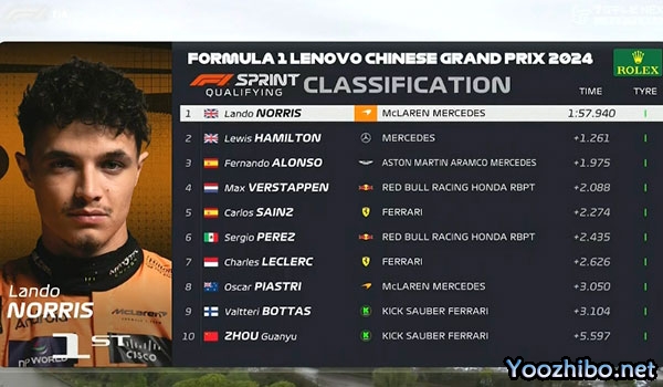 24直播网讯 北京时间4月19日,F1中国大奖赛冲刺赛排位赛结束,周冠宇进入Q3,最终排名第10。诺里斯获得杆位,汉密尔顿、阿隆索分列2-3位,周冠宇的队友博塔斯第9。