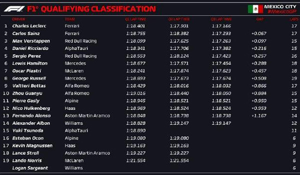 24直播网讯 北京时间10月29日,2023年F1墨西哥城大奖赛排位赛结束,勒克莱尔获得杆位,这也是他职业生涯的第22个杆位;他的队友塞恩斯第二,法拉利车队包揽了正式比赛头排发车位。红牛车队的维斯塔潘排名第三,小红牛车队里卡多第四,主场作战的佩雷兹第五。汉密尔顿、皮亚斯特里、拉塞尔、博塔斯以及中国车手周冠宇分列六至十位。