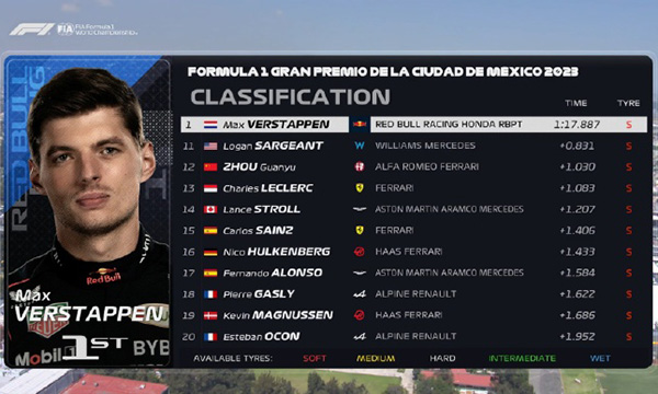 24直播网讯 北京时间10月29日,2023F1墨西哥城大奖赛三练最终成绩:维斯塔潘跑出1:17.887,包揽三次练习赛的头名。阿尔本落后0.070秒排名第二,威廉姆斯车队状态不错!主场车手佩雷兹位列第三,与维斯塔潘单圈有0.139秒的差距。