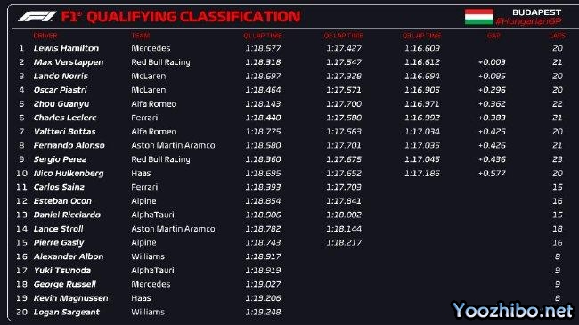 24直播网讯 北京时间07月22日,2023年F1匈牙利大奖赛排位赛在布达佩斯赛道结束,梅赛德斯车队汉密尔顿在Q3最后一圈0.003秒的优势绝杀红牛车队维斯塔潘,取得本赛季个人首个杆位!这也是他第104个杆位,再一次刷新F1历史杆位数纪录;维斯塔潘第二,迈凯伦车队诺里斯第三,他的队友皮亚斯特里第四。