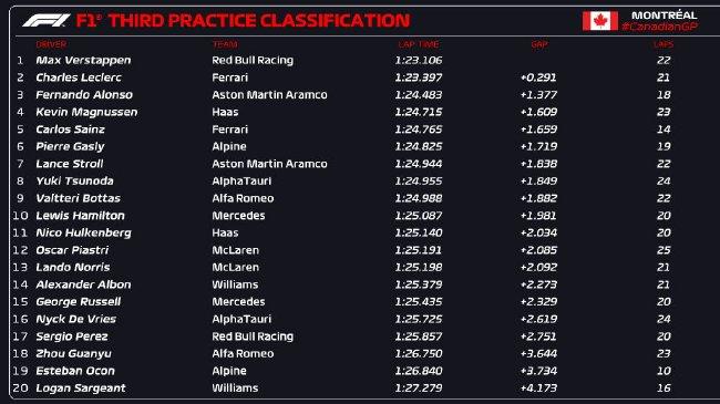 身后的车手距离前两名已经在1秒以上,阿斯顿马丁车队阿隆索第三,与维斯塔潘有1.377秒的差距。马格努森第四,塞恩斯第五,但他在三练中遭遇事故,赛车受损。第六至第十分别是:加斯利、斯托尔、角田裕毅、博塔斯和汉密尔顿。