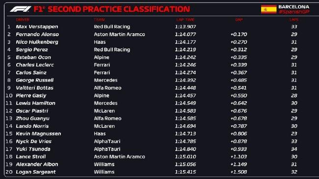 2023年F1西班牙大奖赛第2次练习赛成绩表: