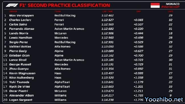 24直播网讯 2023年F1摩纳哥大奖赛第二次练习赛结束。最终红牛车队维斯塔潘凭借1:12.462的成绩取得二练头名,法拉利车队勒克莱尔第二,软胎单圈与维斯塔潘的差距只有0.065秒;塞恩斯第三,落后维斯塔潘0.107秒。