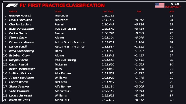 24直播网讯 北京时间05月06日,2023年F1迈阿密大奖赛第1次练习赛结束,梅赛德斯车队拉塞尔以1:30.125排名第一,他的队友汉密尔顿落后0.212秒排名第二,法拉利车队勒克莱尔落后0.324秒排名第三。维斯塔潘和塞恩斯分列四五位,排名六至十位的车手分别是加斯利、阿隆索、斯托尔、霍肯伯格、奥康。