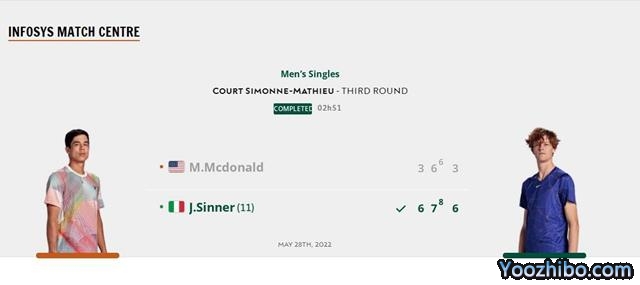 - 【录像】[QQ国语]法网男单第3轮 麦克唐纳德vs辛纳 第三盘 录像2022-05-28 20:48:37