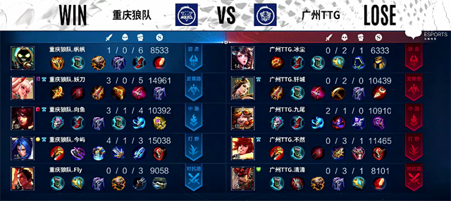 开局双方相互入侵野区,太乙真人拿下一血。1分10秒中路团战,重庆狼队打出0换2。2分31秒橘右京拿下暴君。3分10秒上路团战,周瑜被击杀。4分22秒橘右京拿下主宰。4分40秒裴擒虎推掉下路一塔。5分30秒虞姬推掉下路二塔。5分48秒橘右京推掉中路一塔。6分10秒橘右京拿下暴君。8分钟大乔被击杀。8分20秒公孙离推掉下路二塔。8分45秒橘右京拿下主宰。9分30秒下路交火,双方1换1。10分39秒公孙离拿下暴君。12分50秒橘右京拿下主宰。14分钟重庆狼队强推上路高地塔,团战打出0换2。15分10秒橘右京拿下暴君。17分10秒野区团战,重庆狼队打出0换2。17分45秒重庆狼队推掉水晶率先拿下一分。