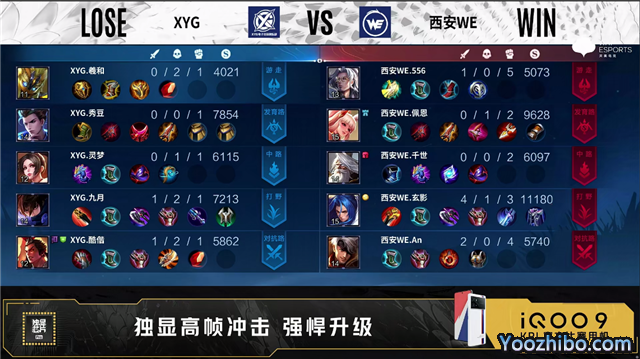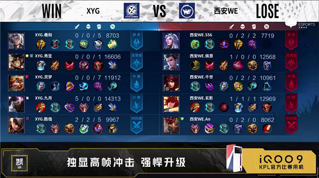 第五局双方常规开局。1分08秒XYG野区击杀廉颇拿下一血。2分11秒西安WE拿下先知主宰。2分42秒中路团XYG打出1换2。3分43秒XYG中路击杀廉颇。4分15秒XYG摧毁敌方对抗路外塔。5分19秒XYG摧毁敌方发育路外塔。6分22秒西安WE拿下主宰。6分47秒XYG摧毁敌方发育路二塔。7分53秒XYG拿下暴君,随后摧毁敌方对抗路二塔。8分28秒西安WE摧毁敌方发育路外塔。8分30秒发育路团XYG打出0换2。8分53秒XYG摧毁敌方中路外塔。10分24秒XYG拿下暗影主宰。11分23秒XYG摧毁敌方发育路高地塔。12分20秒XYG拿下暗影暴君。12分54秒XYG摧毁敌方中路二塔。14分09秒XYG拿下暗影主宰。15分13秒XYG摧毁敌方中路高地塔。16分17秒XYG拿下暗影暴君。16分46秒XYG摧毁敌方对抗路高地塔。18分12秒XYG拿下暗影主宰。19分17秒双方水晶处1换1。19分24秒XYG摧毁敌方水晶拿下比赛。