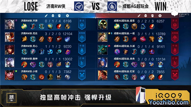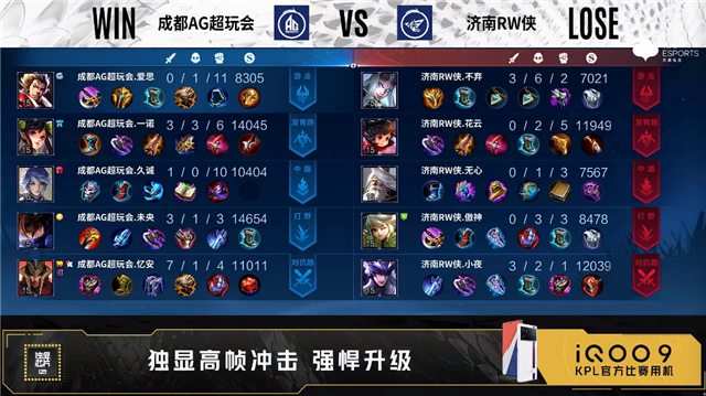 双方常规开局。6分10秒济南RW侠主宰处击杀太乙真人拿到一血。6分34秒济南RW侠拿下暴君。7分47秒济南RW侠中路击杀太乙真人。8分59秒成都AG摧毁敌方对抗路外塔。9分21秒成都AG野区击杀鲁班七号。10分42秒成都AG拿下暗影暴君。11分17秒成都AG摧毁敌方发育路二塔。12分51秒济南RW侠中路击杀墨子。13分17秒主宰处团战成都AG击杀镜。13分31秒成都AG拿下暗影主宰。13分58秒济南RW侠野区击杀虞姬。14分33秒济南RW侠拿下暗影暴君。16分33秒成都AG中路打出0换2。16分45秒成都AG发育路打出0换2。17分14秒成都AG摧毁敌方水晶拿下比赛。