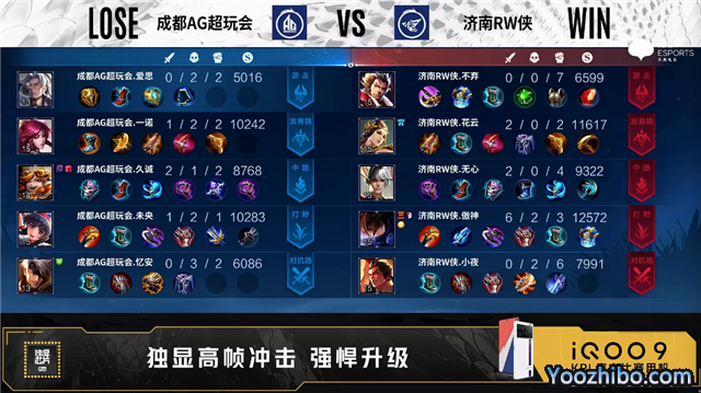 双方常规开局。46秒济南RW侠发育路击杀马可波罗拿到一血。2分24秒成都AG中路击杀不知火舞。2分46秒成都AG拿下暴君。3分43秒济南RW侠拿下主宰。5分36秒成都AG摧毁敌方中路外塔。5分47秒济南RW侠摧毁敌方发育路外塔。8分53秒成都AG摧毁敌方对抗路外塔。7分17秒济南RW侠拿下暴君。9分10秒野区团战济南RW侠击杀盾山。9分58秒中路团战济南RW侠打出1换3,曜拿到三连决胜。12分24秒野区团战成都AG打出1换3。14分43秒野区团战成都AG打出0换2。15分24秒成都AG拿下暗影暴君。16分10秒成都AG摧毁敌方中路二塔。17分09秒济南RW侠对抗路击杀盾山。18分07秒对抗路团战成都AG打出0换5。18分55秒成都AG摧毁敌方水晶拿下比赛。