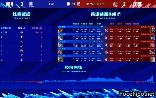十一分四十秒双方再次在河道爆发团战,清融安琪拉闪现追击带走残血镜,武汉eStarPro顺势拔掉中一塔;十四分二十秒XYG三人抓到关羽掉点,随后抢到暗影暴君并带走对面中辅,后又五人集火击杀曜,XYG打出持续掉点后势如破竹直冲水晶,拿下最终胜利!
