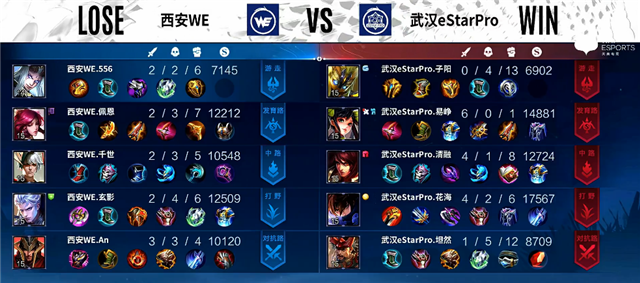 2分20秒上路团战,吕布拿下一血。3分钟镜拿下暴君。3分55秒澜拿下主宰。4分10秒主宰团,武汉eStarPro打出0换2。5分钟河道团战,武汉eStarPro打出0换2。5分24秒澜推掉下路一塔。7分钟镜被击杀。8分钟澜拿下暴君。8分10秒下路团战,武汉eStarPro打出2换3。9分17秒镜拿下主宰。9分40秒下路团战,西安WE打出0换2。10分钟马可波罗推掉中路一塔。10分17秒澜拿下暴君。10分30秒中路团战,西安WE打出0换2。11分26秒澜拿下主宰,团战双方3换3。12分40秒上路团战,武汉eStarPro打出0换2。14分20秒镜拿下暴君,团战武汉eStarPro打出1换3。14分59秒吕布推掉中路一塔。15分24秒镜拿下主宰。18分钟镜拿下暴君。19分钟上路团战,武汉eStarPro打出1换5团灭西安WE。20分钟武汉eStarPro推掉水晶追回一分。
