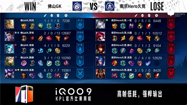 1分53秒,上路团战1换1。2分14秒,南京Hero久竞控下先知主宰,随后佛山GK控下暴君。3分38秒,南京Hero久竞破掉佛山GK上一塔。4分22秒,双方团战1换1。4分40秒,南京Hero久竞破掉佛山GK下一塔。5分50秒,双方团战再次1换1。6分27秒,南京Hero久竞控下先知主宰。8分05秒,中路团,佛山GK打出0换3,随后破掉南京Hero久竞中一塔。9分48秒,佛山GK击杀蒙恬。10分25秒,佛山GK阿古朵击杀橘右京,随后控下暗影主宰。11分37秒,佛山GK控下暗影暴君。12分24秒,佛山GK破掉南京Hero久竞下二塔。12分57秒,佛山GK破掉南京Hero久竞下高地。14分38秒,佛山GK击杀蒙恬。15分46秒,佛山GK破掉南京Hero久竞上二塔。16分钟,佛山GK破掉南京Hero久竞中二塔。16分37秒,佛山GK击杀橘右京。16分56秒,佛山GK控下暗影暴君。17分12秒,佛山GK击杀东皇太一。17分43秒,佛山GK破掉南京Hero久竞中、上高地。18分20秒,高地团,佛山GK打出0换4,随后一波摧毁南京Hero久竞水晶再下一城。