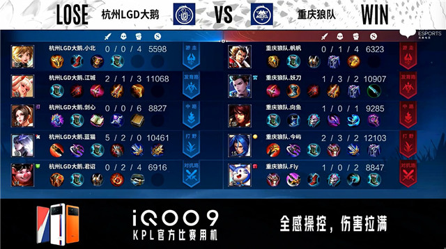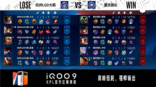 开局杭州LGD大鹅中路公孙离抢线,重庆狼队入侵野区反掉蓝BUFF。2分21秒重庆狼队拿下暴君。3分28秒发育路双方1换1。5分11秒双方对抗路1换1。5分33秒重庆狼队摧毁敌方中路外塔。6分45秒野区团战双方1换1。7分16秒重庆狼队拿下暴君。8分44秒重庆狼队摧毁敌方中路二塔。10分10秒重庆狼队摧毁敌方对抗路二塔。10分43秒重庆狼队拿下暗影主宰。11分41秒重庆狼队摧毁敌方中路高地塔。12分34秒重庆狼队摧毁敌方发育路二塔。12分54秒中路团战杭州LGD大鹅击杀橘右京,重庆狼队摧毁敌方发育路高地塔。13分18秒重庆狼队中路击杀镜。14分06秒重庆狼队拿下暗影暴君。14分32秒重庆狼队拿下暗影主宰。15分12秒重庆狼队摧毁敌方对抗路高地塔。15分40秒重庆狼队摧毁敌方水晶拿下比赛。