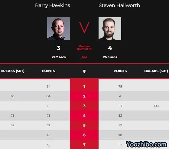 比赛开始后,霍金斯不在状态,跟之前相比出现严重下滑,第一局霍尔沃斯多次上手,以78-64先拔头筹,第二局霍金斯打出单杆63分,以84-4扳回一局,第三局霍尔沃斯不甘示弱,轰出单杆108分还以颜色,虽然目前没有职业资格,但霍尔沃斯确实不简单,具备一定实力。