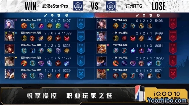 开局广州TTG入侵野区反掉红BUFF。2分10秒广州TTG野区击杀鬼谷子拿到一血。3分59秒广州TTG对抗路击杀鬼谷子。4分43秒广州TTG野区击杀鬼谷子。5分53秒广州TTG野区击杀鬼谷子。7分15秒发育路团战武汉eStar打出1换2。9分06秒武汉eStar野区击杀橘右京。10分26秒广州TTG拿下暗影暴君。10分48秒武汉eStar拿下暗影主宰。13分58秒广州TTG中路击杀娜可露露。14分51秒广州TTG拿下暗影主宰。16分12秒广州TTG摧毁敌方发育路高地塔并打出0换3。16分32秒广州TTG团灭对手摧毁水晶拿下比赛。