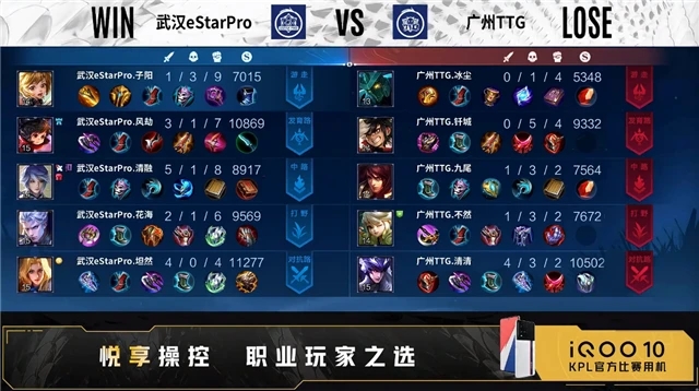 双方常规开局。1分54秒武汉eStar对抗路击杀马超拿到一血。2分10秒武汉eStar拿下主宰。3分54秒广州TTG拿下暴君。5分04秒广州TTG中路击杀孙膑。6分52秒广州TTG马超野区打出0换2。8分05秒广州TTG拿下暴君,团战武汉eStar击杀蒙犽。9分46秒武汉eStar发育路击杀马超。10分21秒武汉eStar中路击杀蒙犽。11分05秒武汉eStar中路击杀阿古朵。12分35秒对抗路双方1换1。13分41秒武汉eStar野区打出0换2。13分50秒武汉eStar摧毁敌方中路外、二塔。14分整武汉eStar中路击杀蒙犽。15分11秒暴君处团战武汉eStar打出1换2并拿下暗影暴君。15分30秒武汉eStar摧毁敌方中路高地塔。15分50秒武汉eStar强点水晶拿下比赛。