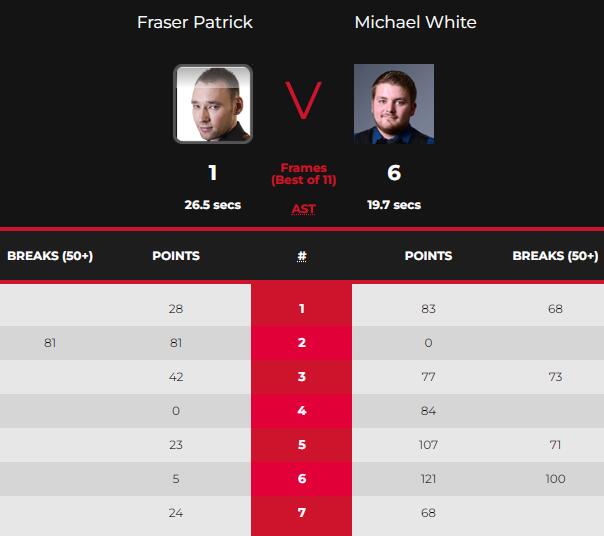- 【录像】[虎牙]世锦赛资格赛第1轮 帕特里克vs迈克尔-怀特 全场录像2022-04-05 09:12:06