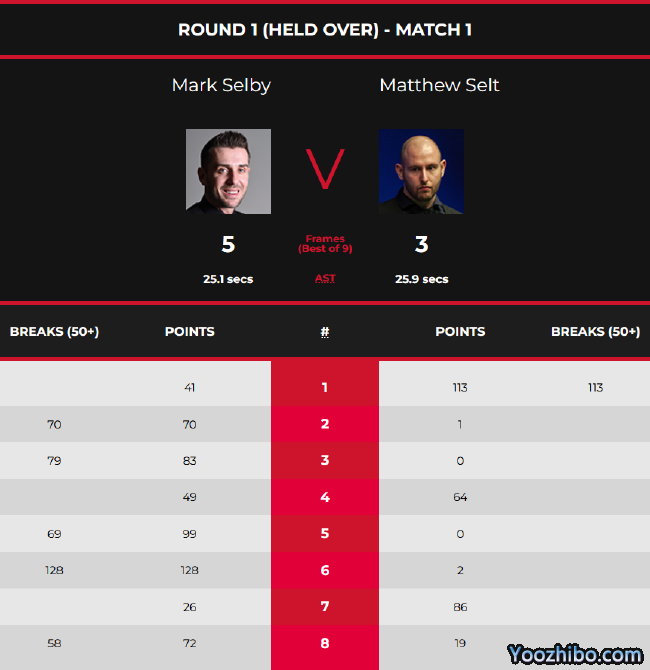 第一局,塞尔比41-0的局面,塞尔比推顶袋不进,塞尔特抓住机会上手,单杆113分拿下第一局。
