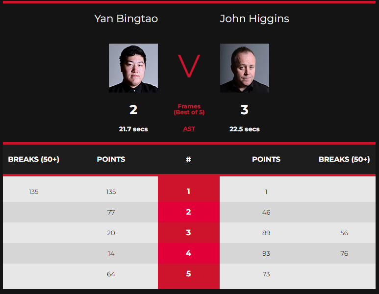 最终,颜丙涛4胜2负晋级4强。来到冠军组半决赛,颜丙涛的对手是希金斯。颜丙涛与希金斯总共有11次交锋记录,战绩为5胜6负。