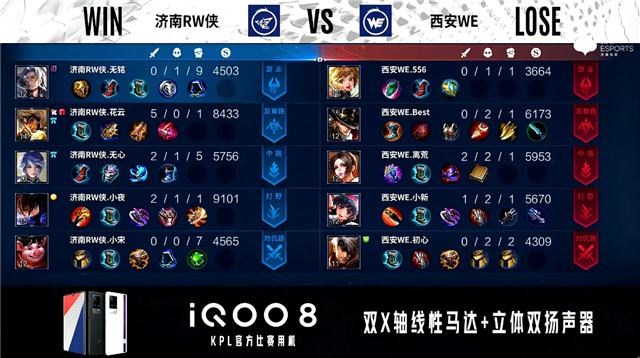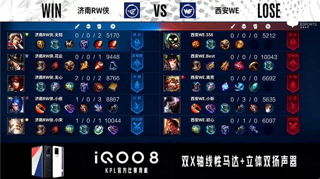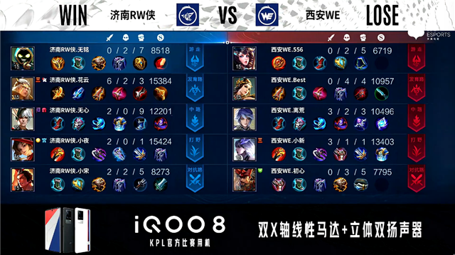 开局西安WE中路、对抗路换线。3分34秒济南RW侠暴君处击杀不知火舞拿到一血。3分50秒西安WE拿下主宰,济南RW侠拿下暴君。4分36秒西安WE野区击杀澜,济南RW侠中路击杀马可波罗。5分08秒济南RW侠对抗路击杀娜可露露。7分21秒济南RW侠摧毁敌方中路、对抗路二塔。8分03秒济南RW侠发育路击杀不知火舞。8分27秒济南RW侠摧毁敌方中路高地塔。8分40秒济南RW侠发育路击杀夏侯惇。8分52秒济南RW侠摧毁敌方发育路高地塔。10分07秒野区团战济南RW侠打出1换4。10分33秒济南RW侠摧毁敌方水晶拿下比赛。