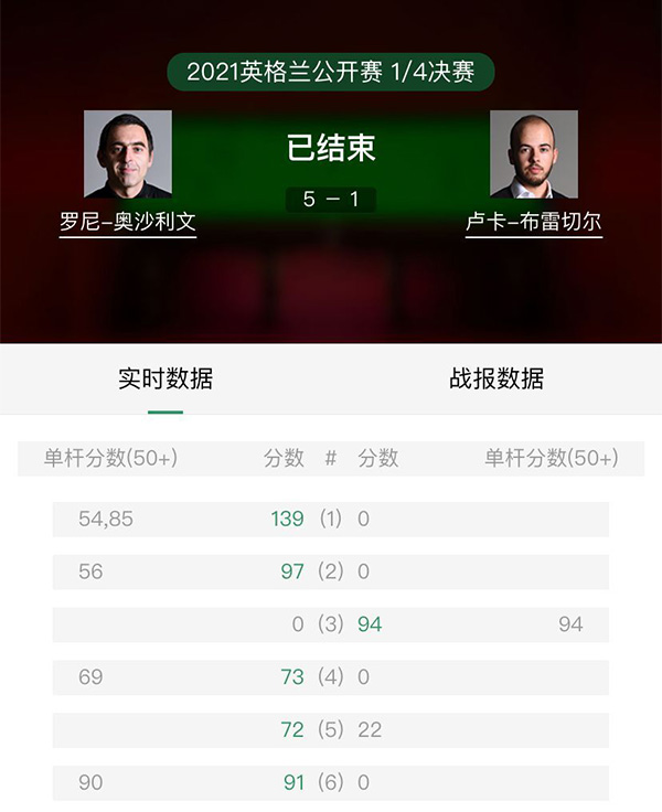 综合直播斯诺克 2021斯诺克英格兰公开赛1/4决赛 奥沙利文vs卢卡-布雷切尔 全场录像回放