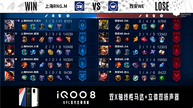 双方常规开局。2分13秒上海RNG.M中路击杀嬴政拿到一血。3分06秒西安WE发育路击杀盾山。3分44秒西安WE拿下主宰。3分56秒西安WE对抗路击杀阿古朵。4分07秒西安WE发育路击杀盾山。5分06秒中路团西安WE打出1换2。5分33秒西安WE摧毁敌方中路外塔。5分51秒西安WE拿下暴君。6分28秒西安WE对抗路打出0换3。6分52秒西安WE摧毁敌方中路二塔。7分18秒西安WE发育路打出0换2。7分40秒西安WE摧毁敌方发育路高地塔。8分03秒西安WE拿下主宰。8分36秒西安WE击杀盾山并摧毁敌方对抗路高地塔。10分23秒西安WE野区击杀马超。10分37秒西安WE拿下暗影暴君。11分06秒中路团战上海RNG.M打出1换3。12分51秒西安WE野区击杀盾山。13分21秒西安WE摧毁敌方中路高地塔。13分51秒西安WE强点敌方水晶拿下比赛。