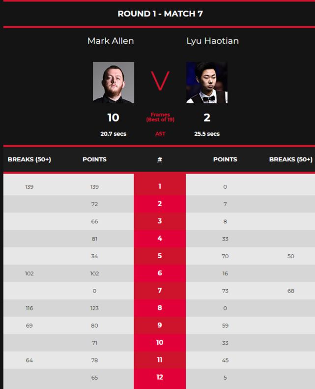 24直播网讯 北京时间4月21日凌晨,斯诺克世锦赛第一轮,中国新星吕昊天与马克艾伦的第二阶段决战打响!第一阶段,吕昊天2-7大幅落后于马克艾伦。第二阶段,吕昊天依旧毫无起色,连输3局之后,2-10惨败出局,遭遇一轮游!