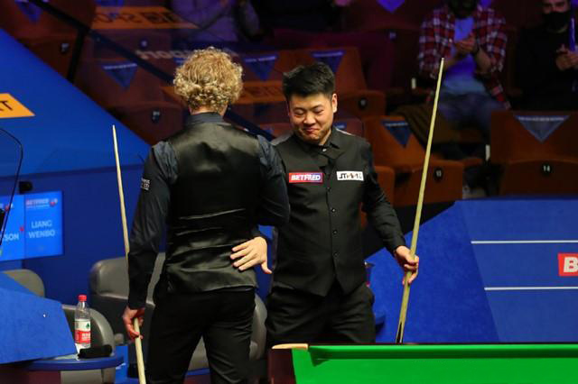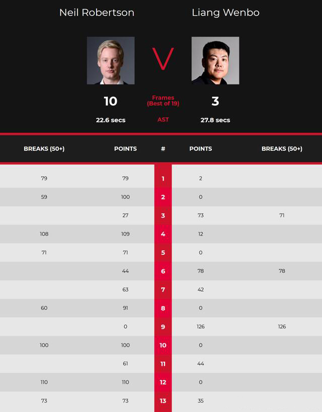 第12局,梁文博进攻不进,罗伯逊单杆110分拿下。罗伯逊9-3赛点。第13局,梁文博三次上手机会,拿下了35分,罗伯逊单杆73分,10-3拿下比赛。