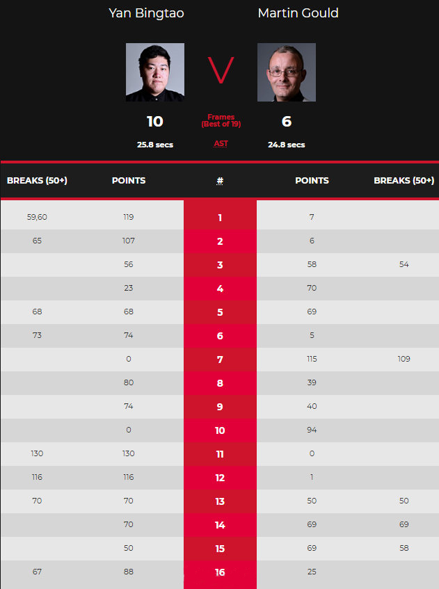 第15局,古尔德以69-50挽救一个赛点。第16局,颜丙涛打出了单杆67分,并最终以10-6取胜,晋级下一轮。在第二轮的比赛中,颜丙涛将会对阵墨菲和马克·戴维斯之间的胜者。