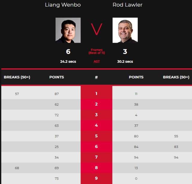 本场比赛,梁文博在前四局取得4-0完美开局。第5局,罗德-劳勒单杆55分制胜,4-1扳回一局。第6局,罗德劳勒又打出单杆83分,84-25再扳一局,比分来到4-2。